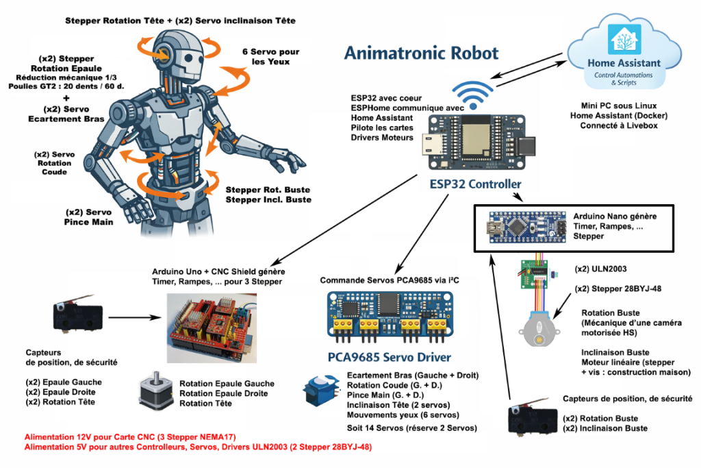 - Commande par stepper des deux épaules de l’automate avec Uno + CNC, mécanique qui supporte le bras, supervision identique au stepper tête avec Home Assistant (reste à affiner et dupliquer pour le bras gauche, ajouter contact position Zéro)