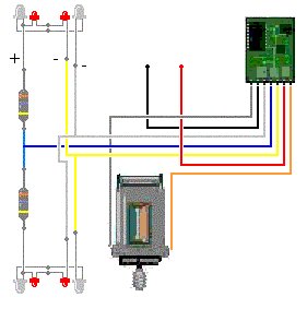 L'intégration - des LED'S : 2 rouges (feux arrière) + 2 blanches (feux avant) + 1 jaune (cabine) - décodeur entre les prises de capture tension des rails et le moteur DC, commande PWM