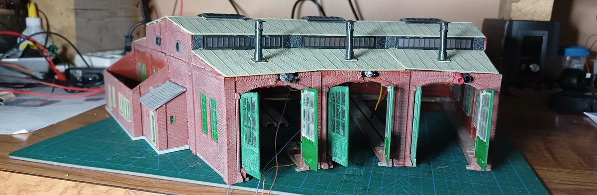 Rotonde avec 3 portes commandées par servomoteur, détecteur de présence loco, éclairages, générateurs de fumée
